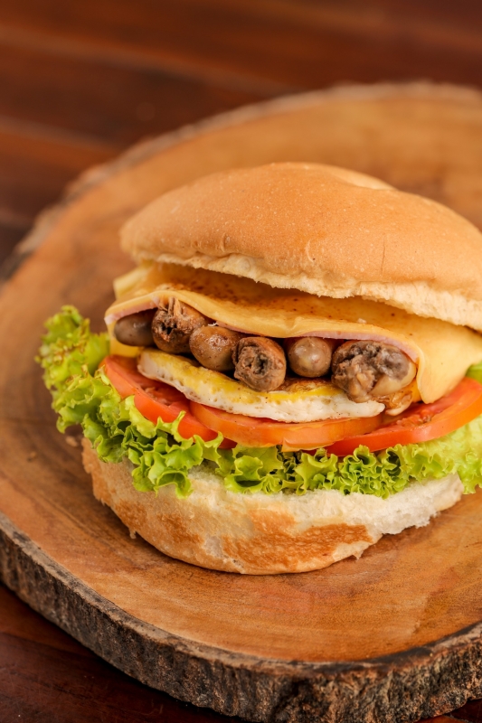 Pão bola, coração de galinha, ovo, presunto, queijo, tomate, alface e molho especial.