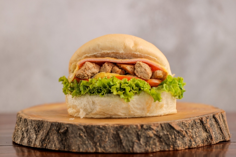 Pão bola, frango, queijo, presunto, ovo, tomate, alface e molho especial.
