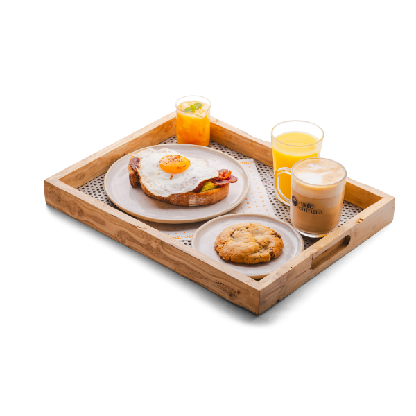 Panini Americano (uma fatia de pão campanha, pasta de abacate, bacon, um ovo frito e pimenta calabresa), um cookie com gotas de chocolate, salada de frutas, suco de laranja integral e café (espresso puro ou com leite).