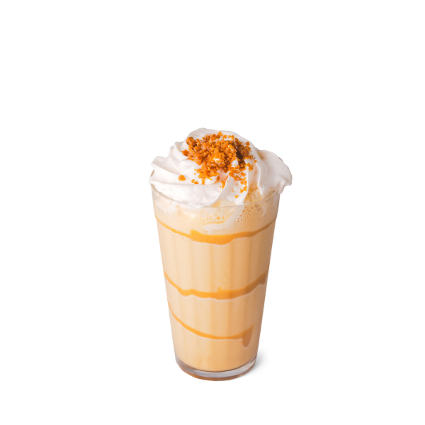 Uma dose de espresso, base para frappé, caramelo salgado, leite e chantilly
