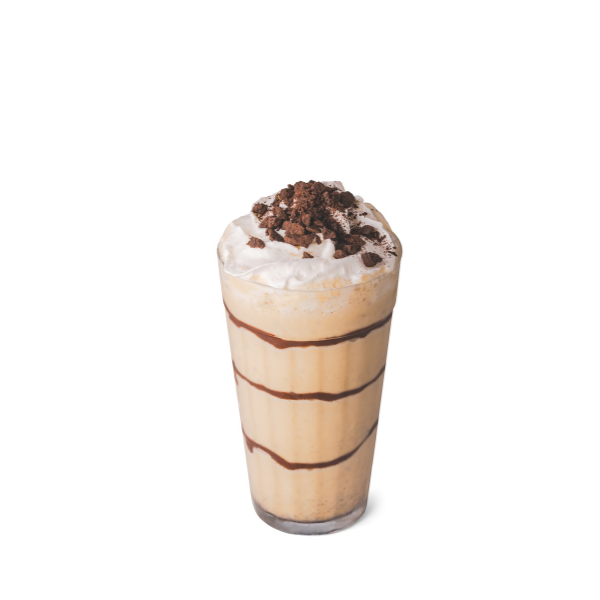 Uma dose de espresso, base para frappé, bolachas de chocolate, leite e chantilly
