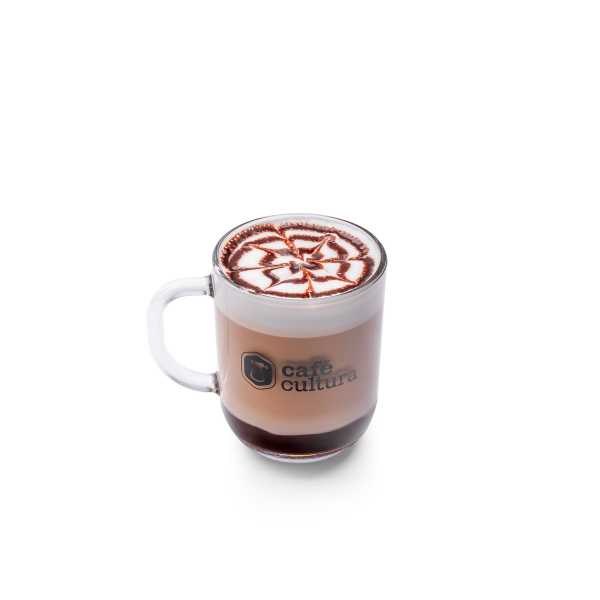 Espresso extraído sobre calda de chocolate, leite vaporizado e cobertura de calda de chocolate. ( Contém lactose nos ingredientes complementares)