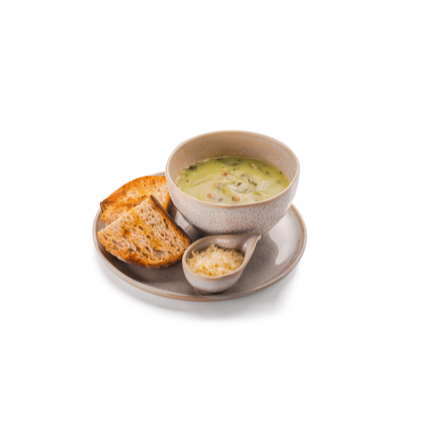 Caldo verde com batata, couve, linguiça e sal. Acompanha queijo parmesão e pão de fermentação natural