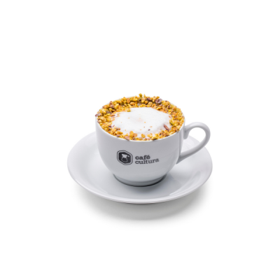Espresso extraído sobre ganache de pistache, com leite integral cremoso e pistache granulado.