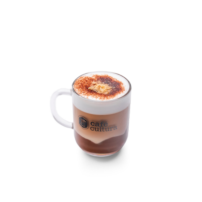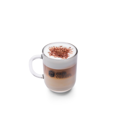 Espresso com leite, calda de chocolate, cacau e canela. (Contém lactose nos ingredientes complementares)