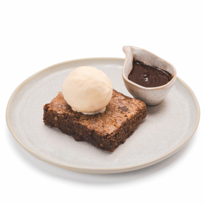 Delicioso brownie, chocolate e nozes. Acompanha sorvete de creme e calda de chocolate.