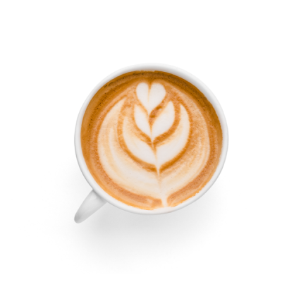 Espresso com leite vaporizado, xarope de avelã e raspas de chocolate
