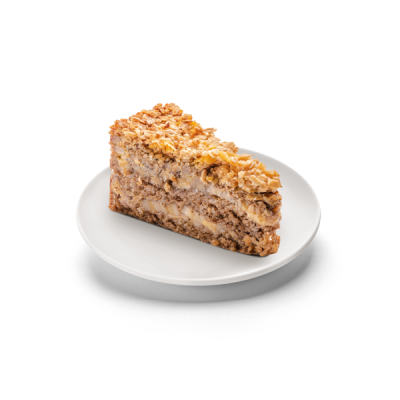 Torta de banana com canela, com base de farinha integral e aveia, coberta com granola (fatia).