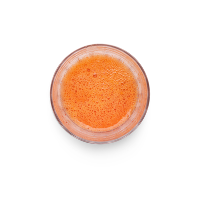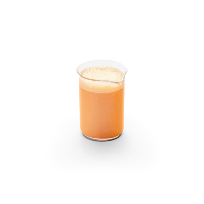 Suco de laranja e mix termogênico (cúrcuma, fibra de aveia, gengibre, maca peruana, laranja amarga, canela, pimenta-caiena e pimenta-do-reino).