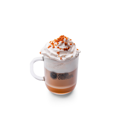 Espresso, leite vaporizado, cobertos por chantilly, crocante de caramelo salgado e calda de caramelo salgado