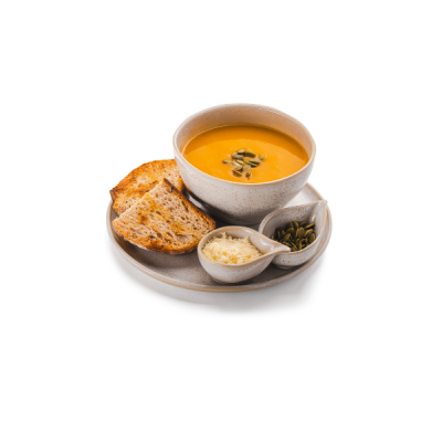 Sopa de abóbora com gengibre e sal. Acompanha semente de abóbora tostada, queijo parmesão e pão de fermentação natural