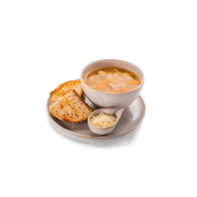 Canja de galinha com batata, cenoura, arroz e salsinha. Acompanha queijo parmesão e pão de fermentação natural