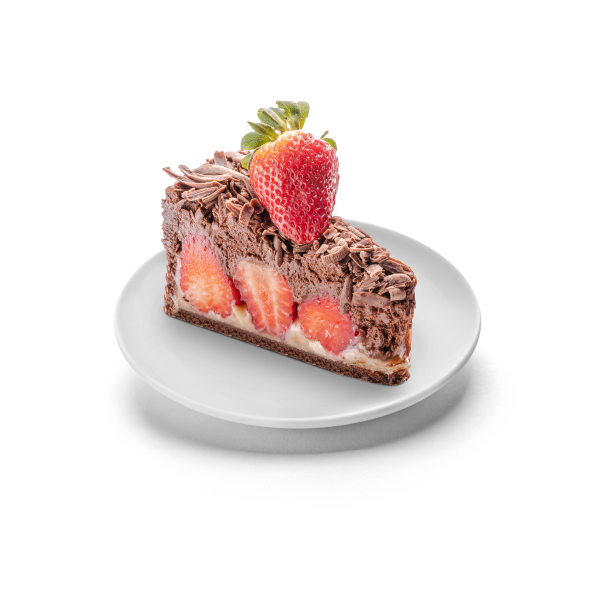 Torta de morango com chocolate, montada sob massa fina e delicada de biscoitos (fatia)