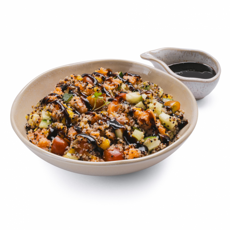 Mix de quinoa, salmão defumado, tomate cereja, manga e pepino japonês