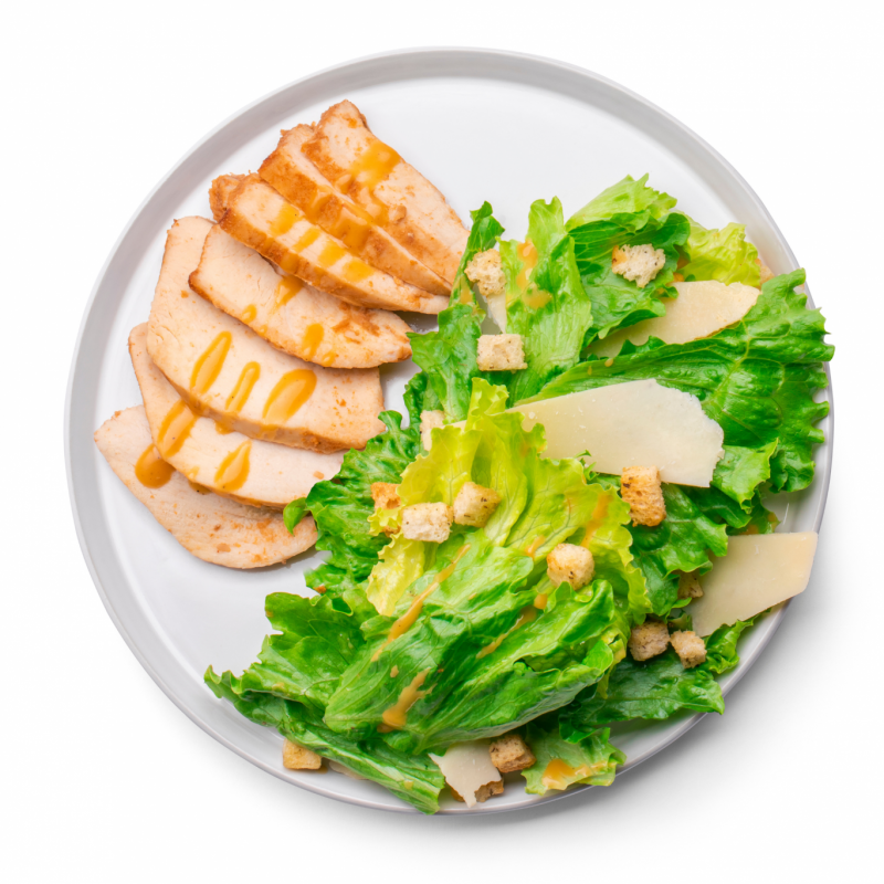 Alface americana, molho caesar, frango grelhado em fatias, queijo parmesão e croutons