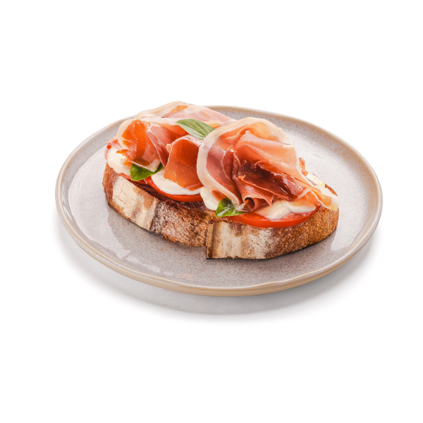 Pão de fermentação natural, presunto parma, mussarela de búfala, tomate, azeite de oliva e manjericão