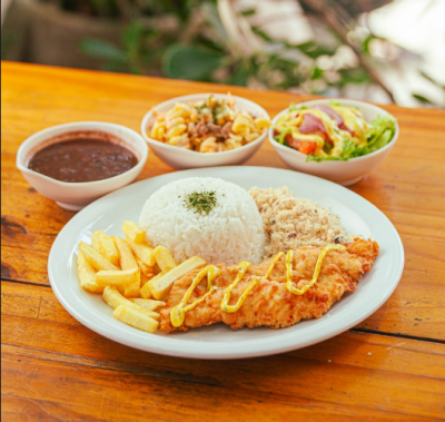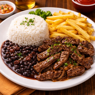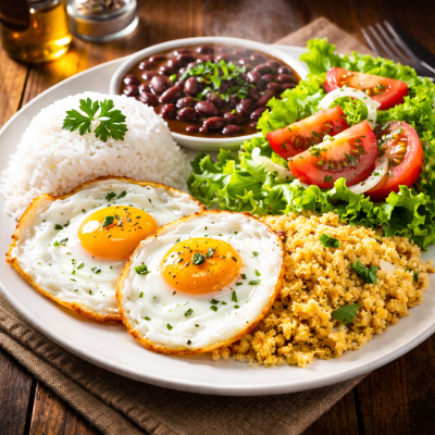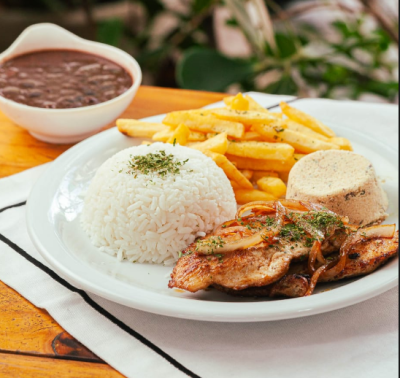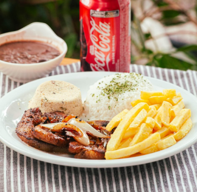 Todos os pratos acompanham arroz, feijão, farofa e mais um acompanhamento (salada, fritas ou purê).