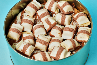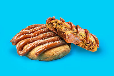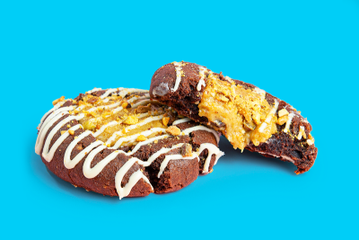 Cookie mesclado com três chocolates (meio amargo, ao leite e branco), recheado com creme Kinder Bueno e coberto com chocolate Kinder. Explosão de sabor!