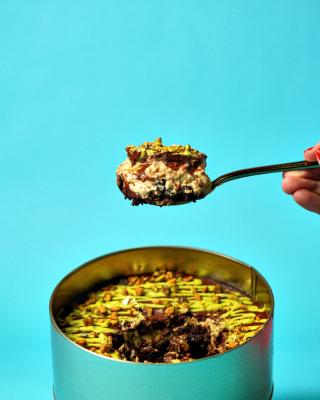 Massa de triplo chocolate recheada com creme de pistache, cobertura de chocolate branco e farofa de pistache.