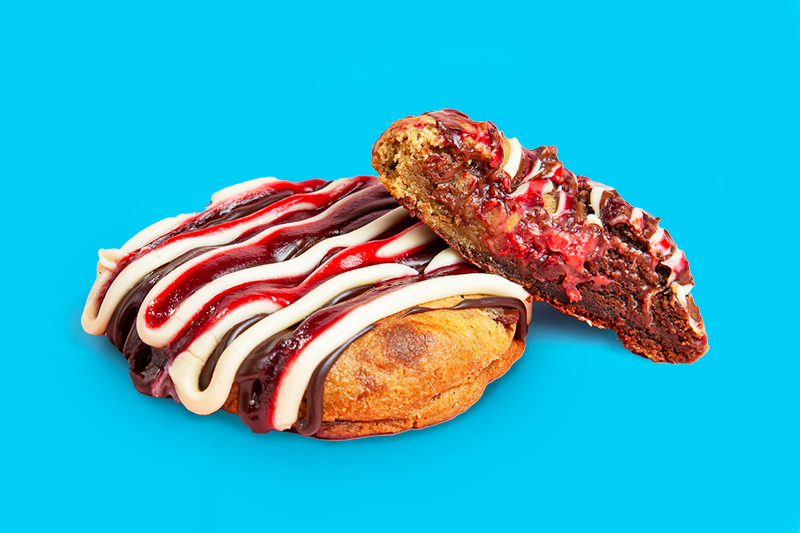 Massa de triplo chocolate com recheio de framboesa e cobertura de chocolate. Doce com toque ácido.